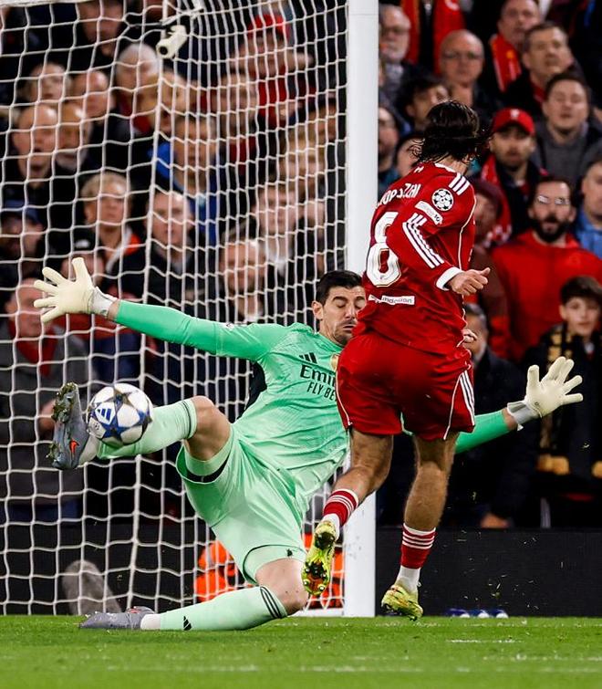 第28分钟利物浦创造出了一次极具威胁的反击机会,维尔茨右路横敲,索博斯洛伊跟进的推射被库尔图瓦神扑化解,半场比赛结束之前,非常活跃的索博斯洛伊大禁区外开炮,库尔图瓦单掌将皮球挡出底线,靠着门将的神勇发挥,皇马艰难带着0-0的比分回到了更衣室。