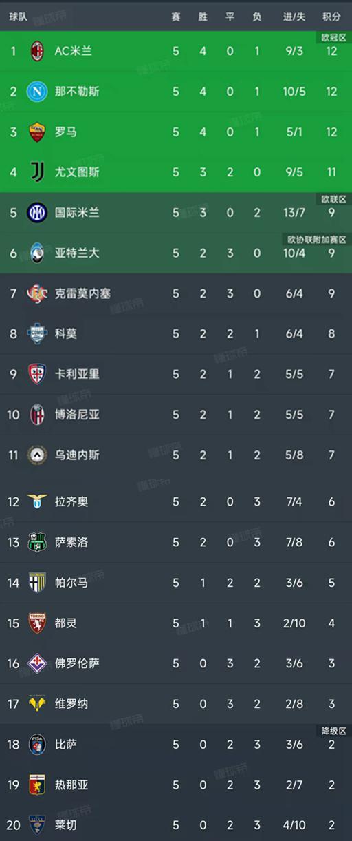北京时间9月30日,意甲第5轮结束了所有比赛,最新积分榜如下!